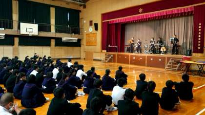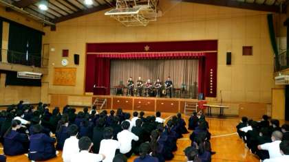 パーカッション集団「PPP]の皆さんしによる「芸術鑑賞会」を開催しました。スネアドラムやシンバル、木琴など、様々な打楽器が次々に登場します。会場はPPPの皆さんの迫力ある演奏に包まれています。