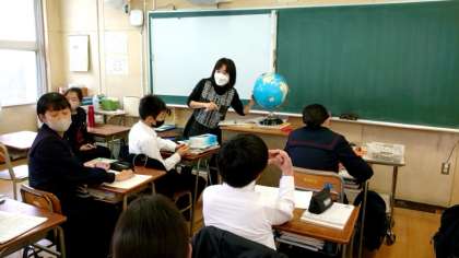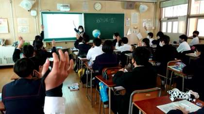 1年生社会科で「時差」を学習中。経度が15度違うと1時間の時差が生じます。先生が地球儀や世界地図を使って「時差の仕組み」をくわしく説明。今、5時間目の授業時間なのでロンドンは夜明け前の朝5時前ですね。