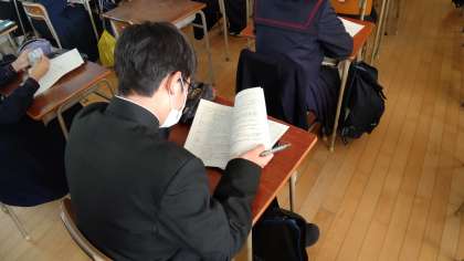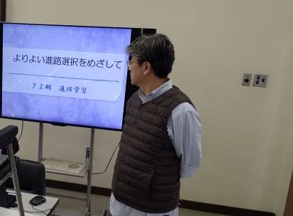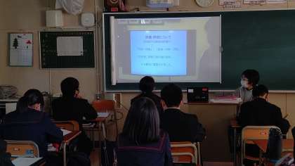 1年生では5限に「進路学習」を行いました。2年後の進路に向けて、今から学習が始まっています。進路担当の先生の説明がプロジェクターで映し出され、皆さん冊子にメモを取りながら学習を進めています。時間のある時にぜひ、先輩からも話を聞いてみてくださいね。