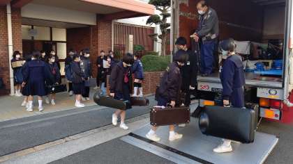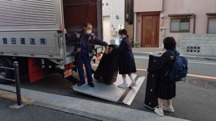 吹奏楽部の皆さんが大きな楽器からトラックに積み込んでいます