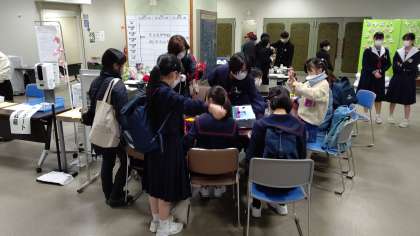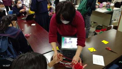 1階のロビーでは各中学校のワークショップが行われています。高津中は「指編み・クリスマスリースを作ろう」のコーナーを家庭科部が実演しました。多くの参加者で賑わっていましたね。