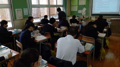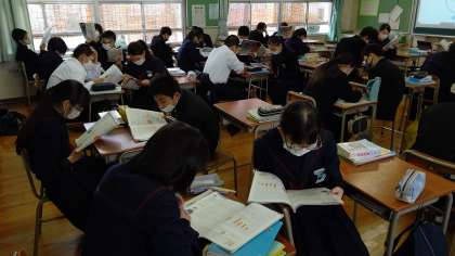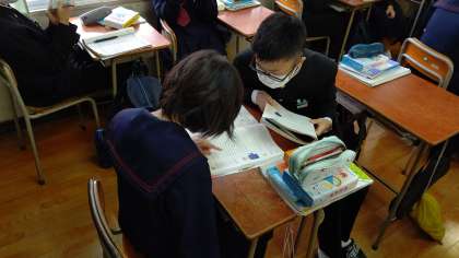 2年生の英語の授業では「映画の調査」を題材にした問題にチャレンジしています。ペアで何度も長文を読み返すことで、どんどん上達しているようですね。読み返した後、文章に書かれている内容について問題を解いていきました。グラフも見ながら答えを導き出す問題もあったようですね。