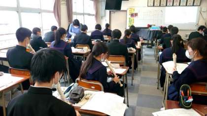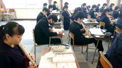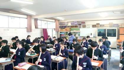 3年生音楽の授業でアルトリコーダーを演奏します。高音や低音を上手に吹くコツがあるとのこと。どのくらい吹けているか、各自がプリントにチェックしていきます。先生からのアドバイスを参考に、美しいメロディーを奏でましょう。