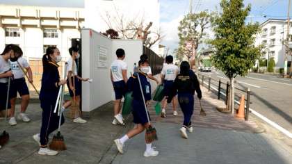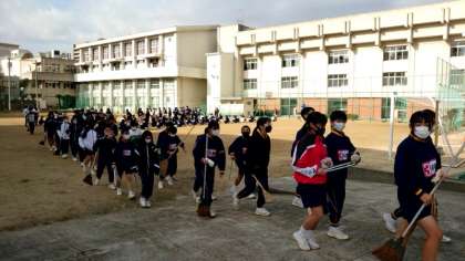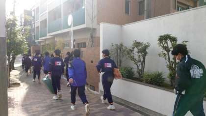 落ち葉を集めるための大きな熊手やチリトリ、ホウキなど、いろんな清掃用具を手に出発しました。公園は多くの地域の方が利用する憩いの場。気持ちよく利用できるよう、頑張ってくださいね。