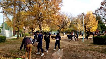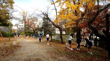 エリアをいくつかに分けて、溜まった落ち葉を集めます。掃いても掃いても落ち葉が減らず、苦戦している人もいる模様。今こそみんなで協力し、チーム力を発揮しましょう。