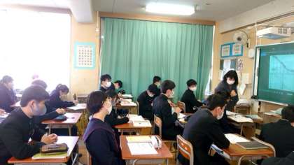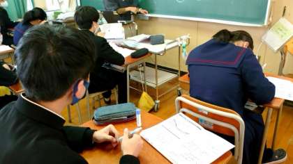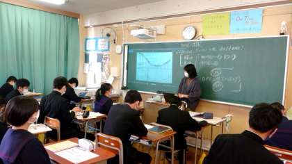 3年生理科の授業で「力学的エネルギー」を学習中。ジェットコースターの動きから、位置エネルギー・運動エネルギーについて教わります。物理の視点から遊園地の乗り物を考えるのは興味深いですね。