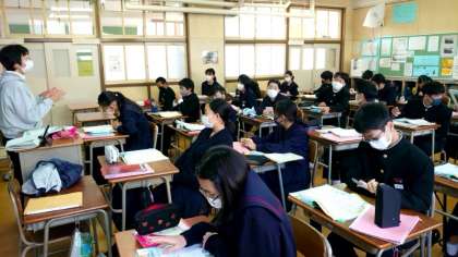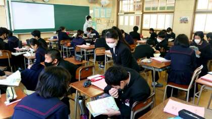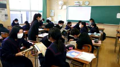 1年生英語の授業で英会話を練習中。WhatやCan、Whoを使った質問を考えて、英語でやりとりします。教わった英文が増えたので質問の種類が増えてきましたね。