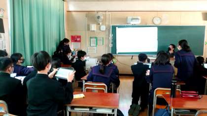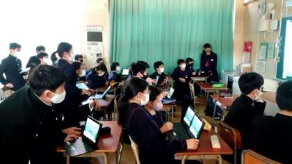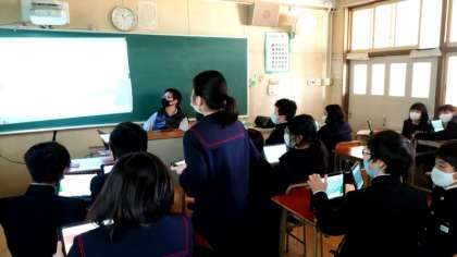 1年生理科の授業でクイズ大会を開催中。これまで学習してきた理科の問題(クイズ)がスクリーンに次々に映されます。生徒の皆さんはタブレット端末を使って正答数を競います。さて誰が優勝するでしょうか?
