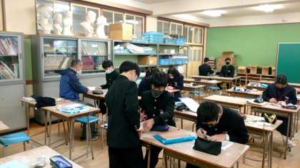 1年生美術科で木製スタンプ(ハンコ)を制作します。印面はもとよりハンコの持ち手のデザインを各自で考え、作品をつくります。まずは電動糸ノコやヤスリを使って、大まかな形状を整えます。ユニークで楽しい作品になれば良いですね。
