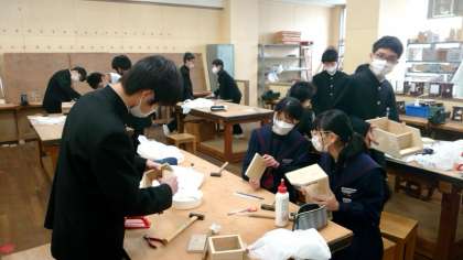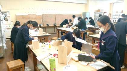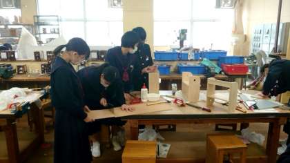 1年生技術科で製作している木製ラック。製作過程も後半に入った模様。大まかな形が出来上がり、引き出しなどのパーツを作っています。金づちで釘を打つトントンという音があちこちから聞こえてきますね。