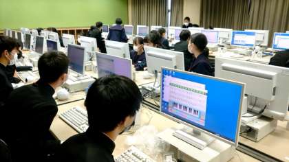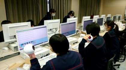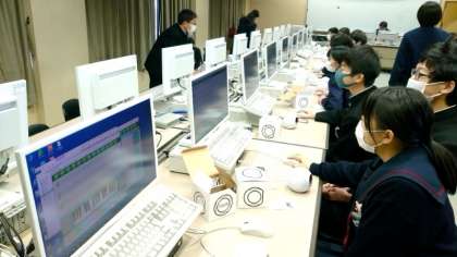 2年生技術科でプログラミングの実習中。先月製作した「クロックル」とパソコンをつないで、さまざまなプログラムを打ち込みます。メロディーを入力して音楽を流したり、クロックルを光らせたりするなど、いろんな動作を試してみました。