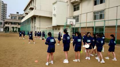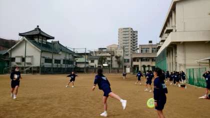 2年生女子体育の授業で「アルティメット」の練習が始まりました。フリスビーを使ってゴールをめざすスポーツです。今日は運動場でフリスビーのスローイングから。時折雪が舞う中、皆さん楽しく練習に励んでいました。