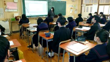 3年生理科の授業で「環境問題」を考えます。プラスティックゴミによる魚や海鳥の被害など、近年、ゴミの投棄による海洋汚染が深刻化しています。環境保護のために私たちができることを考え、実践する姿勢が大切ですね。
