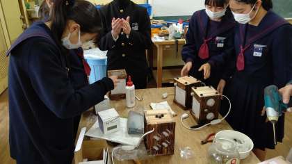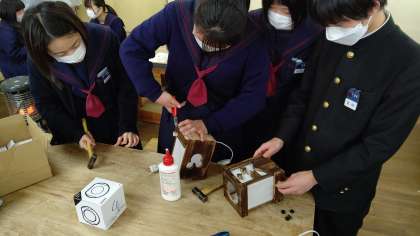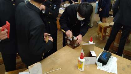 3年2組の技術の授業で作品の総仕上げをおこなっています。釘が出ている所を丁寧に打ち込んだり、ネジをしめたりと細かい作業が続きます。完成めざして頑張ってくださいね。