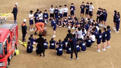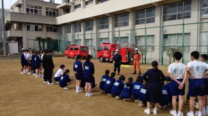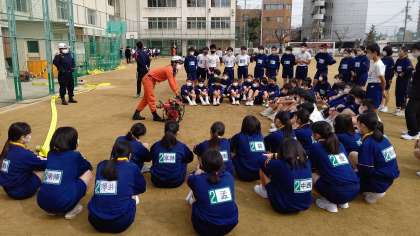 実際に消防士さんが消火に使用しているポンプやホースを使って体験させてもらっています。貴重な体験ができて良かったですね。