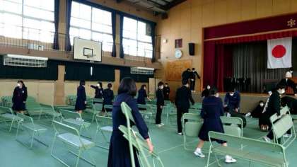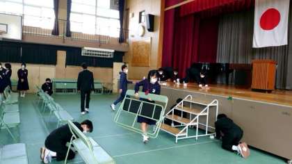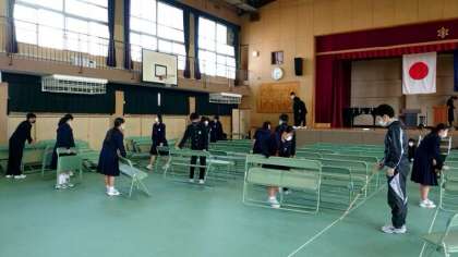 式場では2年生が準備中。メジャーを使って、長イスの間隔を調整します。いつも美しく仕上げてくれて、ありがとうございます。