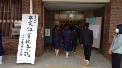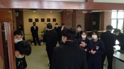 第70回卒業証書授与式が本日挙行されます。春を感じさせる温かいお天気の中、卒業生が登校してきました。在校生にコサージュを手渡され、おめでたい雰囲気で包まれています。