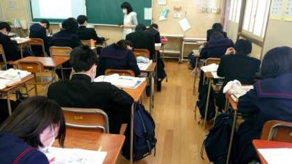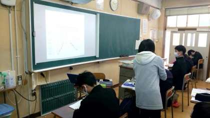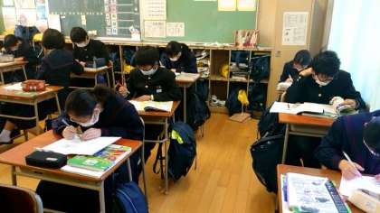 1年生社会科で地形断面図を作図中。地形図の等高線をマークして山の形を描き出します。皆さん上手く描けましたか?