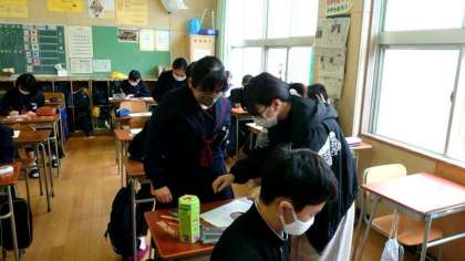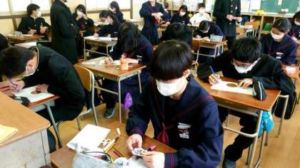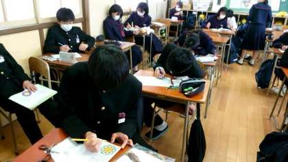 1年生家庭科で、紙製のコースターを作ります。幾何学模様の台紙に好きな色を塗っていきます。皆さん楽しそうに取り組んでいますね。