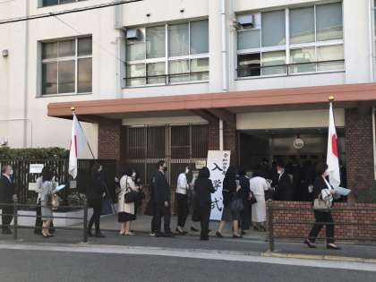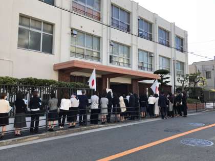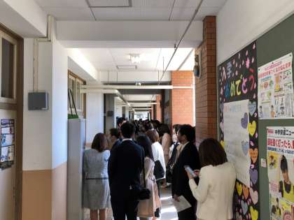 受付時間になりました。校門前には、多くの皆さんが来てくださっています。