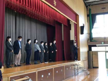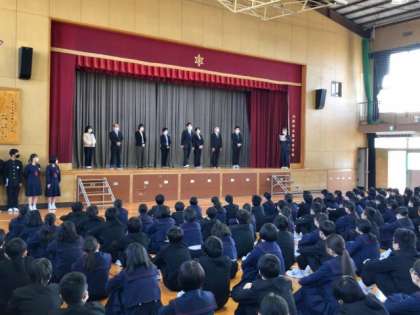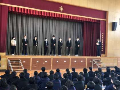 舞台では、各学年所属の先生方を紹介中。これから1年間、生徒の皆さんと一緒に楽しい学校生活を過ごしていきましょう。