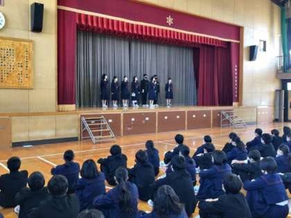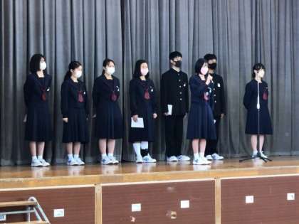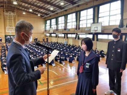始業式後、前期生徒会役員の皆さんの「認証式」を行いました。生徒の皆さんの代表として、行事や諸活動に取り組む予定です。皆さんの活躍を願っています。