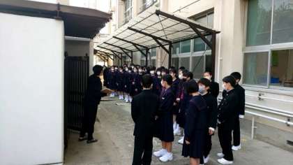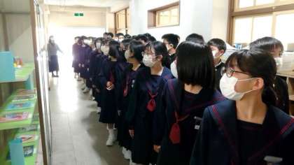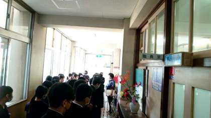 何やら廊下から先生の説明が聞こえてきました。1年生の皆さんが、先生と一緒に校内を見学中。技術室や被服室など、実習の授業で使う教室を案内してもらっています。いろんな教室があるので、少しずつ覚えてくださいね。