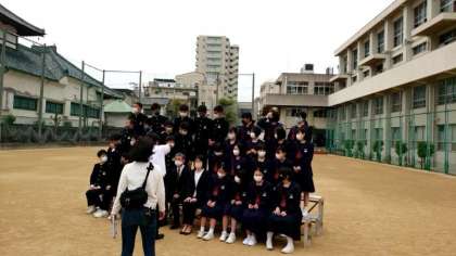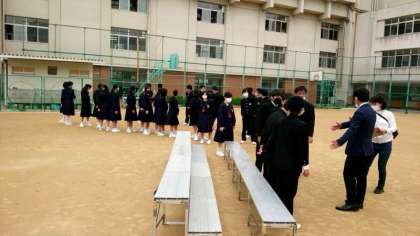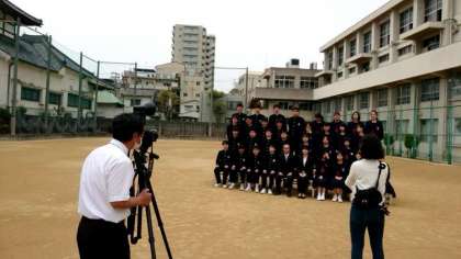 3年生の皆さんの集合写真を撮影します。来月に予定している修学旅行でも、学級写真を撮影します。撮影がスムーズに進むための良い練習になりました。