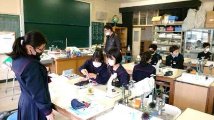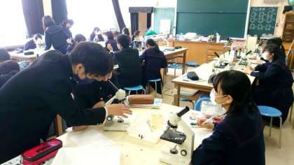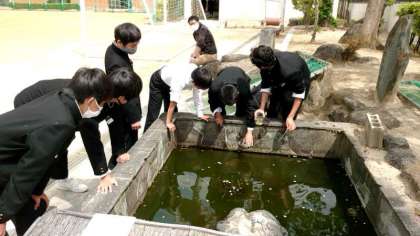 2年生理科の授業で、水中の微生物を観察します。校庭の観察池の水をすくって、顕微鏡で調べます。アオミドロやミカヅキモなどがいるそうですが、皆さん見つかりましたか?