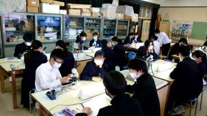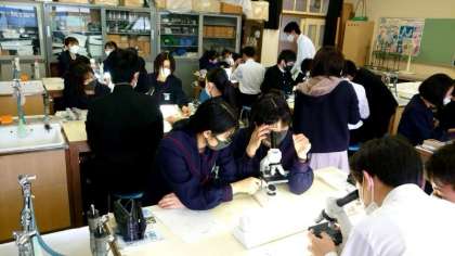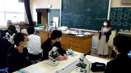 3年生理科の授業で、体細胞分裂を観察します。顕微鏡を使ってタマネギの根の先端を見ていきます。小さい細胞が集まっているようすを確認できましたか?