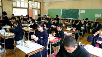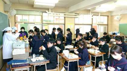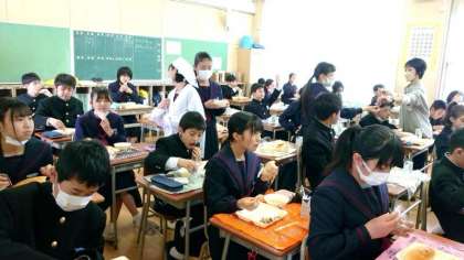 昼休みのチャイムが鳴り、1年生の教室で給食の準備が始まりました。今日は豚肉のデミグラスソース、キャベツとコーンのサラダ、鶏肉のスープの洋食献立。パンにはジャムが添えられていますね。みんなで美味しくいただきましょう。