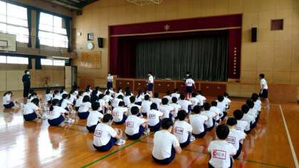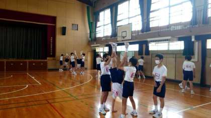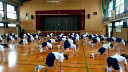 2年生体育科で基礎トレーニングに取り組みます。腕立て伏せや腹筋・背筋を鍛える運動、倒立など、基礎的な筋力やバランス感覚を培うため、みんなと一緒に練習します。1年生の頃に比べて力がつきましたか?