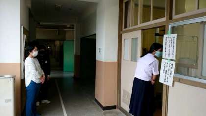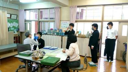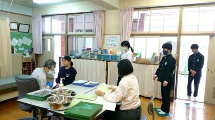 校医先生が来校され、3年の皆さんの耳・鼻のようすを診ていただいています。検診がスムーズに進むよう、皆さん静かに行動していますね。