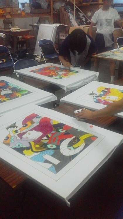 写真は、武者絵を作成しているところです。