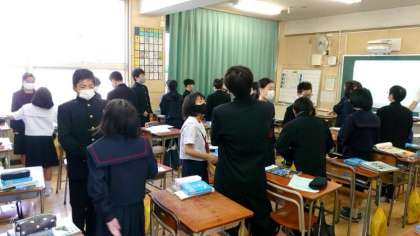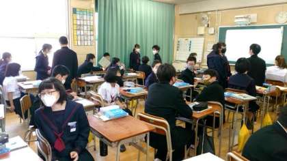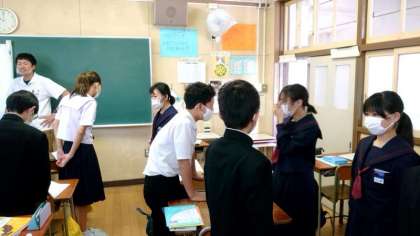 1年生英語科で英会話の練習を行っています。以前考えた「自己紹介」の英文を使って、クラスメイトとやりとりします。身振り手振りを交えながら懸命に伝える姿が、とても微笑ましいです。