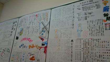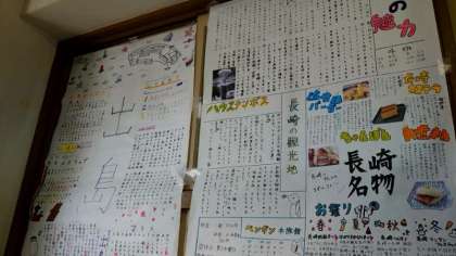 3年生の教室がある3階廊下に壁新聞が掲示されています。修学旅行で訪れる長崎の特徴を各クラスでまとめました。皆さんの創意工夫が感じられる紙面ばかり。旅行気分も盛り上がりますね。