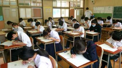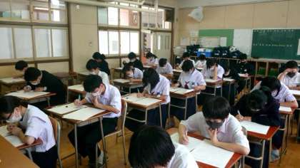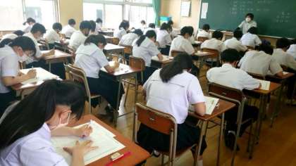 1年生の皆さんも数学のテストに挑んでいます。これまで習った正の数・負の数に関する問題や数直線を使う問題がたくさん出ていますね。今回のテスト内容はこれからの数学の学習のベースになるもの。テストが返却されたら、見直しをしてくださいね。