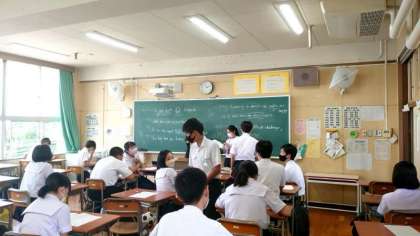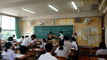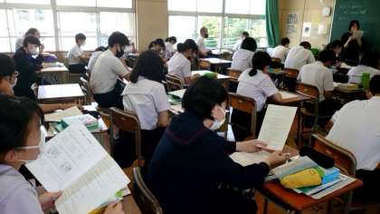3年生英語科の授業で中間テストを返却中。先生から今回の問題のポイントを説明していただきます。解答をお話する都度、生徒の皆さんからため息と歓声が起こります。皆さん、納得いく結果でしたか?