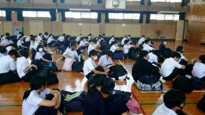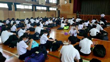 3年生の皆さんが体育館にやってきました。明日からの修学旅行にむけた最終確認です。有明海での体験活動やハウステンボスで着る服など、忘れ物はありませんか?明日は朝の7時35分に新大阪駅集合です。今日は早めに休みましょう。