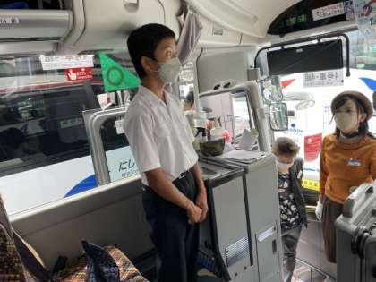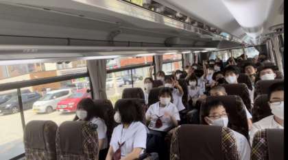クラス1台ずつ、計4台のバスで長崎をめざします。各バスでレクリエーションをやっているようです。