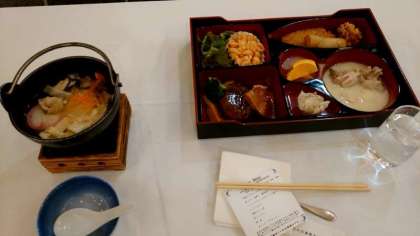 チェックイン後、早速晩ごはんをいただきます。ボリュームたっぷりのメニューですね。
