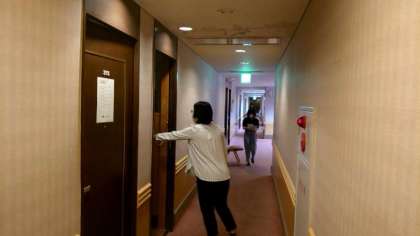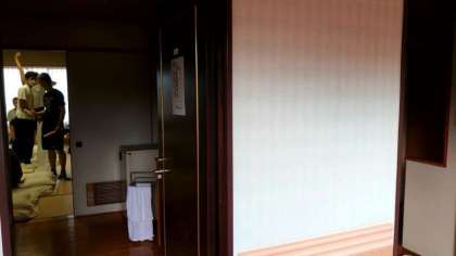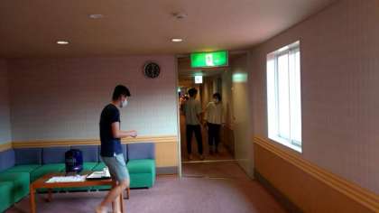 起床の館内放送が流れ、皆さん起きはじめました。まずは検温・健康観察から。身支度を整えて、朝ごはんをいただきましょう。