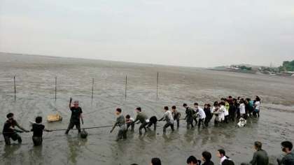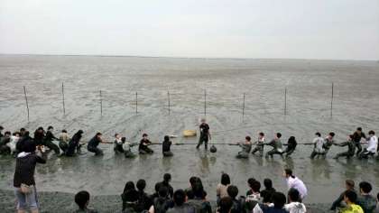 干潟体験恒例の綱引き大会です。まずは1組対3組です。