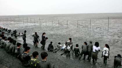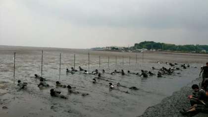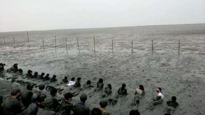 干潟体験最後の競技「腹這い競争」が始まりました。