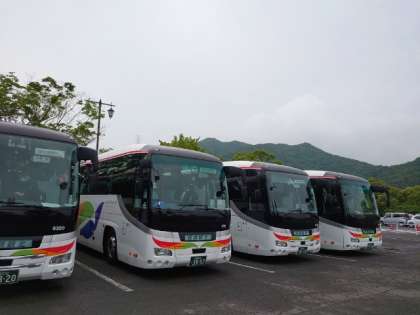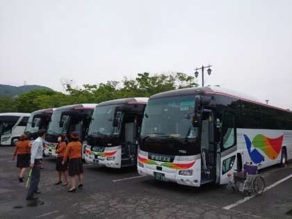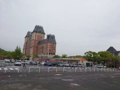 ハウステンボスに到着しました。曇っていますが雨は止んでいます。皆さんの日頃の行いが良いのでしょうね。