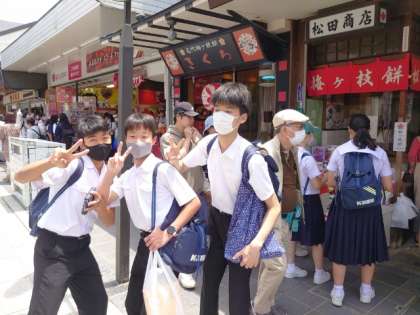 道沿いにはお土産屋さんがずらりと軒を連ねます。名物梅ヶ枝餅も販売されていますね。