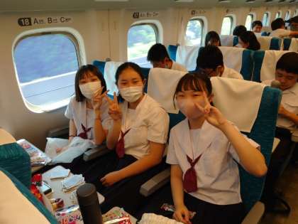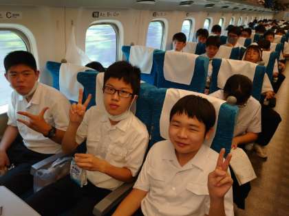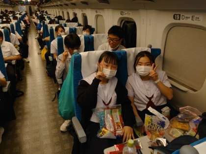新幹線は博多駅を出発し、東へと進みます。小倉駅を過ぎたので、おやつ・ゲームがOKに。皆さん早速ゲームに興じています。
