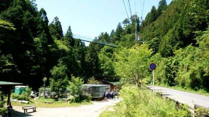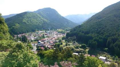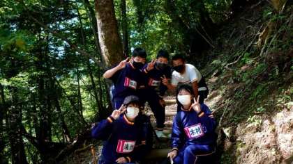 自然の中をグループで散策します。新緑の山々も皆さんを歓迎しています。