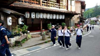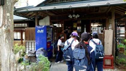 枡源旅館に着きました。身支度を整えて、野外バーベキューに出発します。