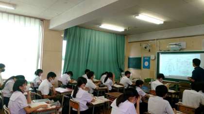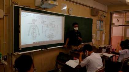 2年生理科の授業で人体の仕組みを学習中。今日は血液の循環を教わります。スクリーンには人体図が写され、皆さん図を見ながら説明を聞いています。図があると、より分かりやすいですね。
